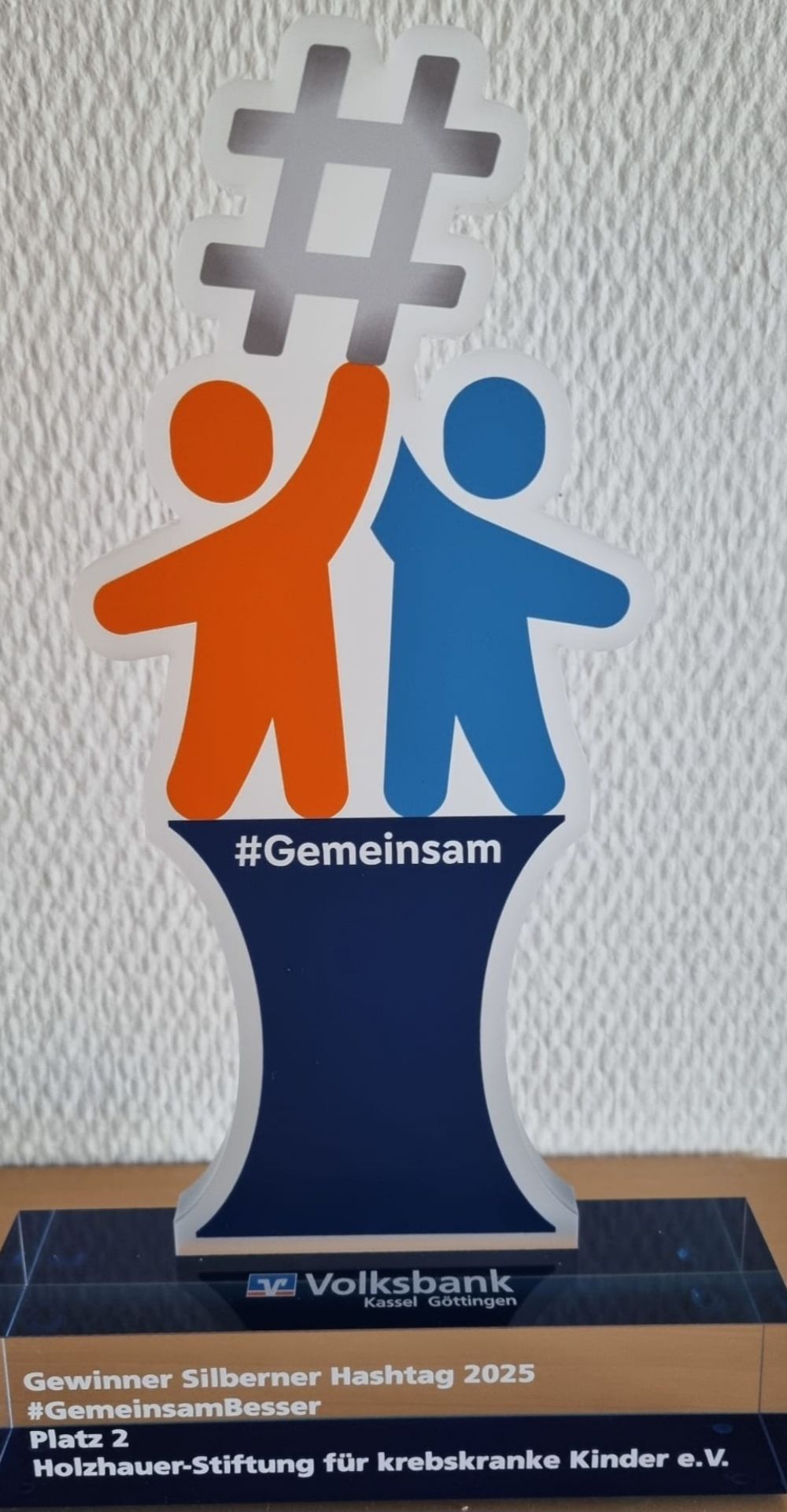 Die Volksbank Kassel Göttingen hat den Förderwettbewerb #GemeinsamBesser durchgeführt. Daran beteiligt haben sich 86 Organisationen aus der Region. Die Preisverleihung fand am 5.11.2025 im feierlichen Rahmen in der Hauptstelle der Bank in Kassel statt. Unsere Stiftung hat dabei den zweiten Preis gewonnen und erhielt von dem Vorstandsvorstitzenden Herrn Wolfgnag Osse eine Urkunde mit einem Pokal. Der Preis war mit 7.000,00 € dotiert. Prämiert wurde das von uns eingereichte Sportprojekt Luftsprung für krebskranke Kinder. Sport bzw. kleine sportliche Übungen sind gerade bei Kindern während und nach der Behandlung von Tumoren sehr wichtig für die Heilung und Lebensqualität. Die Bewegung stärkt die Muskeln und die Ausdauer, da viele Kinder durch das lange Liegen an Rückenschmerzen leiden. Sport hilft nicht nur hiergegen sondern stärkt auch die Psyche, das Selbstvertrauen, macht Spaß und gibt nachhaltig Kraft für die sehr anstrengende Therapie. Er hilft schneller wieder gesund zu werden und ist wichtig für das weitere Leben. Leider übernimmt keine Krankenkasse die Kosten, so dass wir uns freuen mit dem Preis die für das Projekt zuständigen Therapeuten (Sportlehrer und Sportwissenschaftlerin) zu unterstützen.
